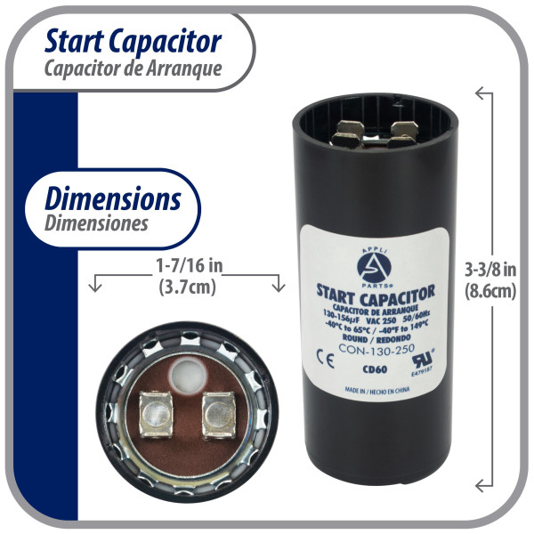 Appli Parts CON-130-250 Capacitor de Arranque 130-156 MFD (microfaradios) uF, 250 VAC. Universal para Motores Electricos, condensador de arranque de 3.7 cm de Diametro, 8.6 cm de Alto