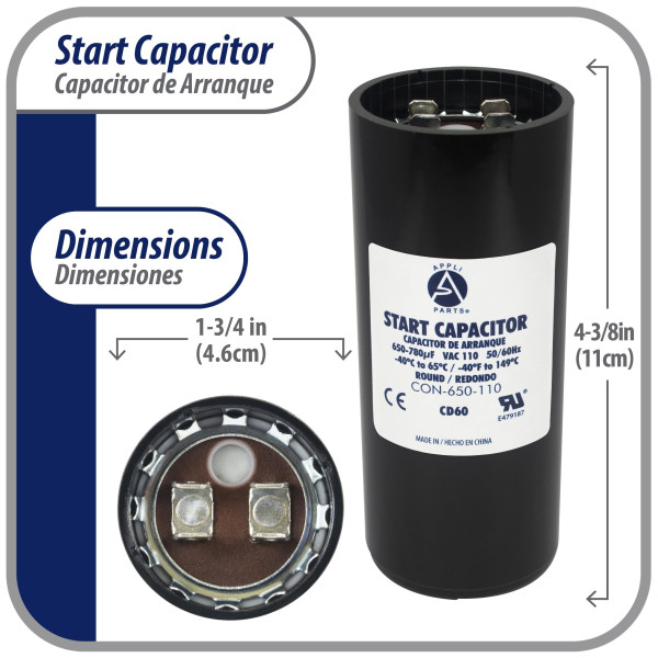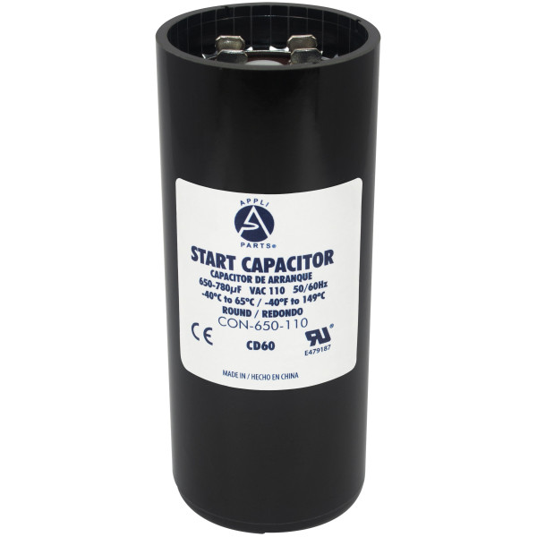 Appli Parts CON-650-110 Capacitor de Arranque 650-780 MFD (microfaradios) uF, 110-125 VAC. Universal para Motores Electricos, condensador de arranque de 4.6 cm de Diametro, 11 cm de Alto